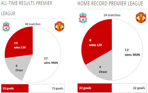 Liverpool lebih sering kalah dalam lima laga kandang terakhirnya melawan United di Premier League. Dalam lima laga itu, Liverpool menelan tiga kekalahan, imbang sekali dan menang satu kali. [initial]