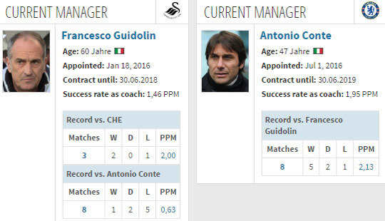 Dalam karier kepelatihannya, Conte belum pernah berjumpa Swansea di kompetisi resmi. Namun, dia sudah delapan kali berjumpa Guidolin di Italia dan lebih sering menang.
