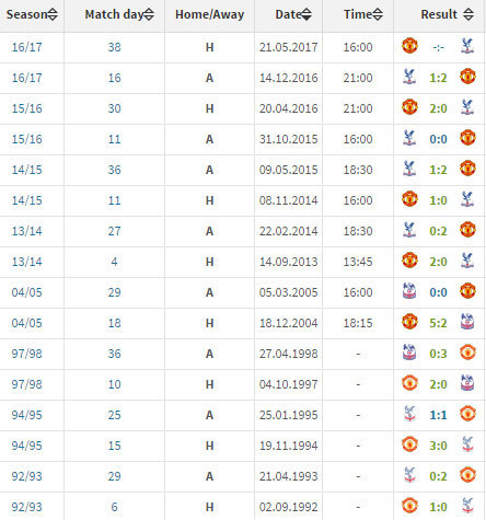 Bola.net - - Peringkat 6 Manchester United akan menjamu peringkat 13 Crystal Palace di pekan terakhir Premier League 2016/17, Minggu (21/5). United belum pernah kalah melawan Palace di kompetisi ini.