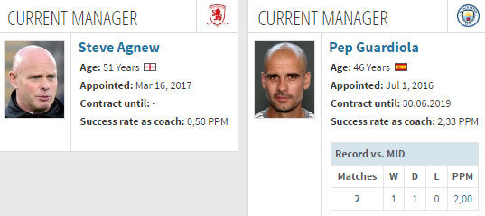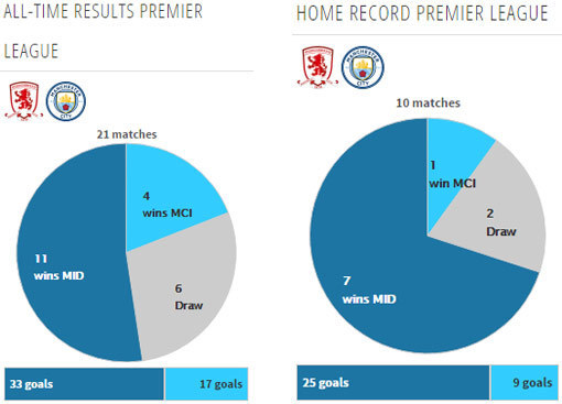 Middlesbrough saat ini memiliki 27 poin dari 34 pertandingan, sedangkan City memiliki 65 poin dari 33 pertandingan.