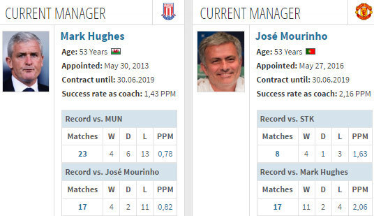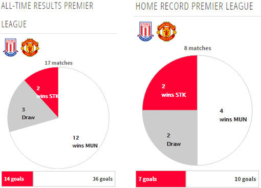 United tak pernah menang dalam tiga laga tandang terakhirnya melawan Stoke di Premier League (S1 K2). Musim lalu, United tumbang 0-2 oleh gol-gol Bojan Krkic dan Marko Arnautovic.