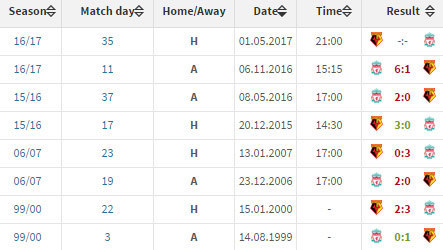 Pada pertemuan pertama di Premier League musim ini, Liverpool meremukkan Watford 6-1 di Anfield. Waktu itu, Liverpool menang lewat brace Sadio Mane serta gol-gol Philippe Coutinho, Emre Can, Roberto Firmino dan Georginio Wijnaldum, sedangkan Watford hanya bisa mencetak satu gol hiburan melalui Daryl Janmaat.