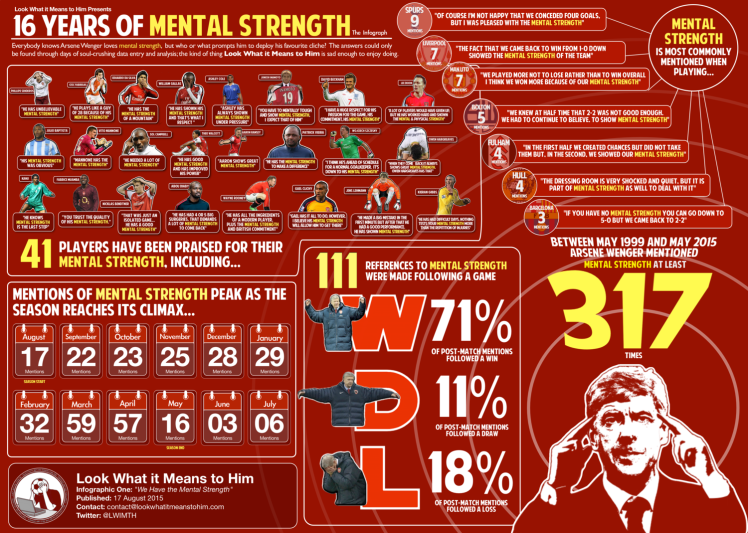 Namun yang mengejutkan, Wenger ternyata punya satu alasan atau frase yang sering ia gunakan dalam menjawab pertanyaan media. Frase yang dimaksud adalah 'kekuatan mental' dan sebuah infografis yang diunggah Metro belum lama ini mengklaim bahwa alasan itu sudah pernah digunakan sang profesor sebanyak 317 kali, antara 1999 hingga 2015.