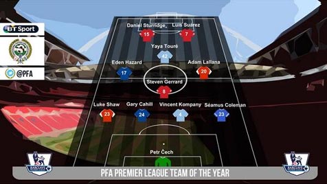 Berikut adalah PFA Team of The Year (formasi 4-4-2): Cech; Coleman, Cahill, Kompany, Shaw; Lallana, Gerrard, Toure, Hazard; Sturride, Suarez. (PFA/hsw)