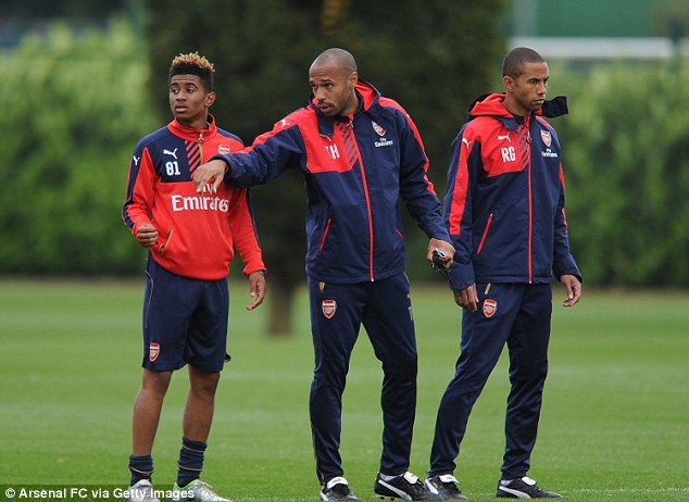 Henry tengah memberikan pengarahan pada pemain Arsenal U-19, Riess Nelson