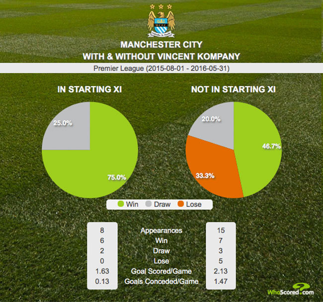 Kompany merupakan komponen penting bagi permainan The Citizen. Catatan statistik menunjukkan bahwa selama Kompany tampil, City belum pernah tersentuh kekalahan.