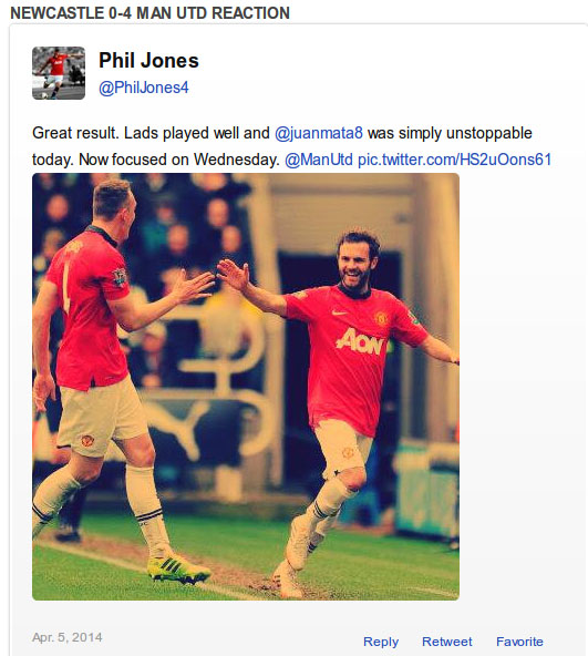 "Hasil yang bagus. Anak-anak bermain dengan baik dan Juan Mata benar-benar tak terhentikan hari ini. Sekarang kami harus fokus pada laga di hari Kamis nanti," tulis Jones di akun miliknya, @PhilJones4.