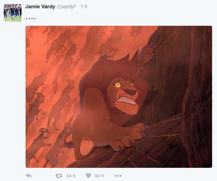 Namun usai Leicester dipastikan juara, setelah Tottenham hanya bisa bermain imbang 2-2 melawan Chelsea di Stamford Bridge semalam, Vardy langsung membalas pesan Kane. Striker Inggris mengunggah gambar singa dari film 'Lion King', yang sedang menunjukkan ekspresi ketakutan di pinggir jurang.