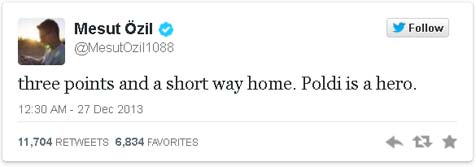 Performa yang ditunjukkan Podolski membuatnya mendapatkan banyak pujian. Tak hanya dari suporter The Gunners, bahkan Ozil juga mengagumi penampilan rekan satu timnya tersebut. Melalui akun twitter pribadinya, Ozil menyebut Podolski sebagai seorang pahlawan dalam laga melawan West Ham itu.