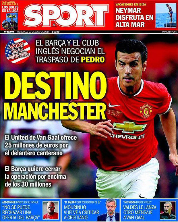 Foto editan Pedro tersebut lantas menghiasi halaman depan Sport, bersama dengan tajuk rencana bertuliskan: "Tujuan berikutnya, Manchester."