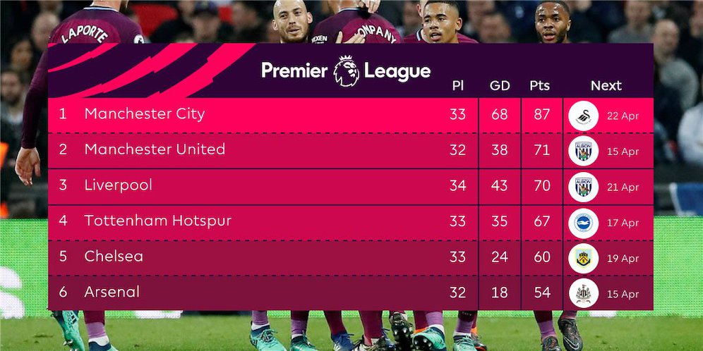 Kini, pasukan Pep Guardiola telah mengumpulkan 87 poin. Secara matematis, Man City hanya butuh tambahan tiga poin untuk jadi juara Premier League musim 2017/18 ini. Tiga poin itu bisa diraih saat menjamu Swansea City pekan depan.