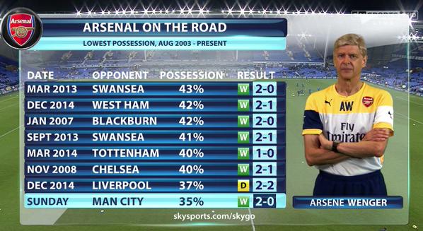 Bukti sahih terbaru dari analisa Sky Sport adalah kemenangan Arsenal dari Manchester City di Etihad dengan skor 2-0. Saat itu pasukan Arsene Wenger keluar sebagai pemenang dengan hanya meraih 35% penguasaan bola.