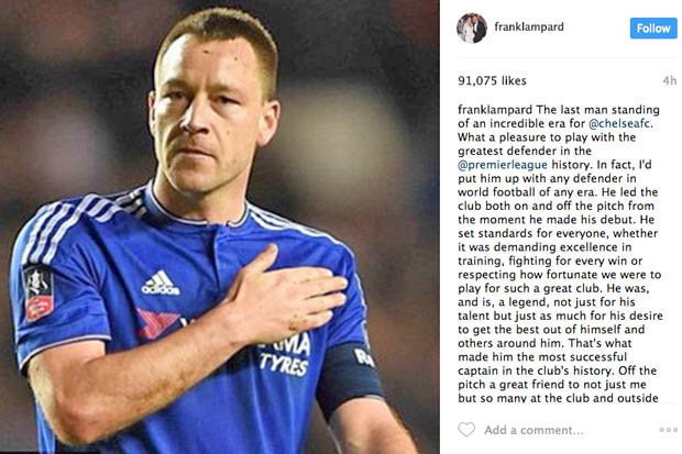 Lampard adalah salah satu sosok yang dekat dengan Terry, usai sempat menghabiskan 13 tahun bersama di Chelsea. Ia kemudian memberikan ucapan selamat pada sang bek, dalam tulisan yang ia unggah di Instagram belum lama ini.