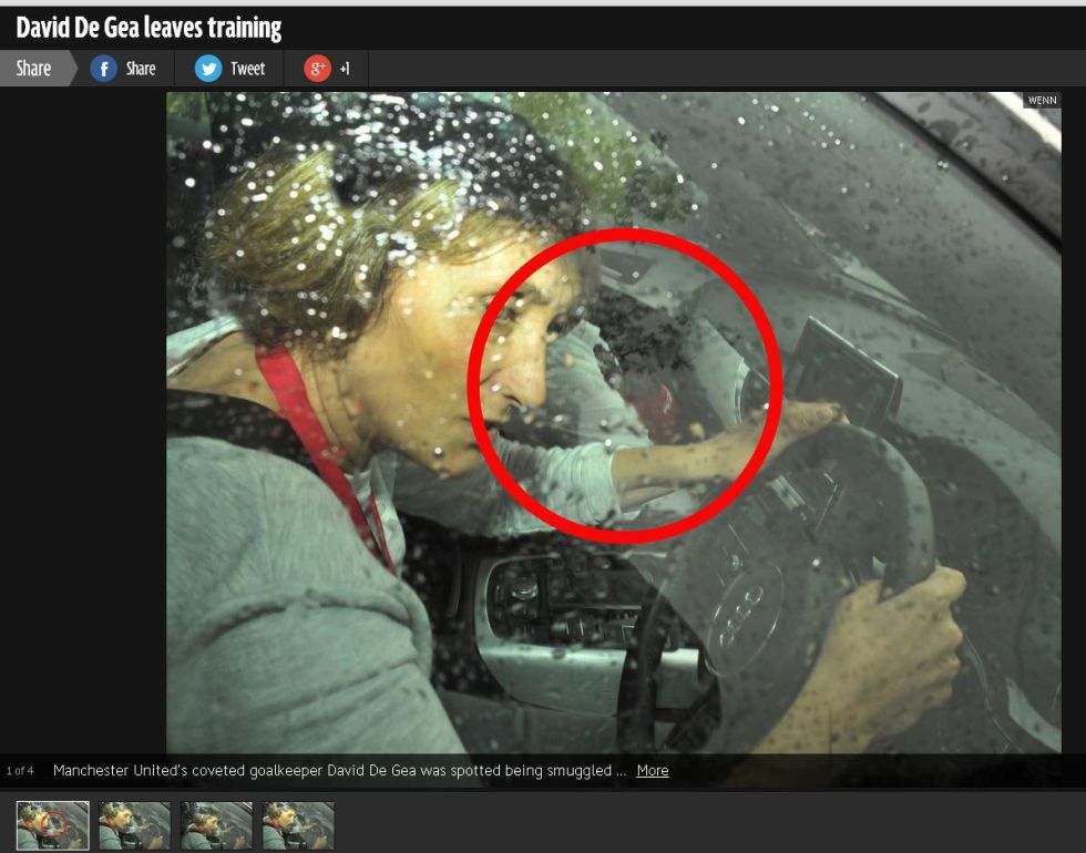 Menurut laporan yang diturunkan oleh The Mirror, De Gea menumpang sebuah mobil Audi yang dikemudikan orang lain, sementara ia duduk di kursi penumpang dengan mengenakan topi berwarna merah dan berusaha menyembunyikan kepala di antara dua kaki.