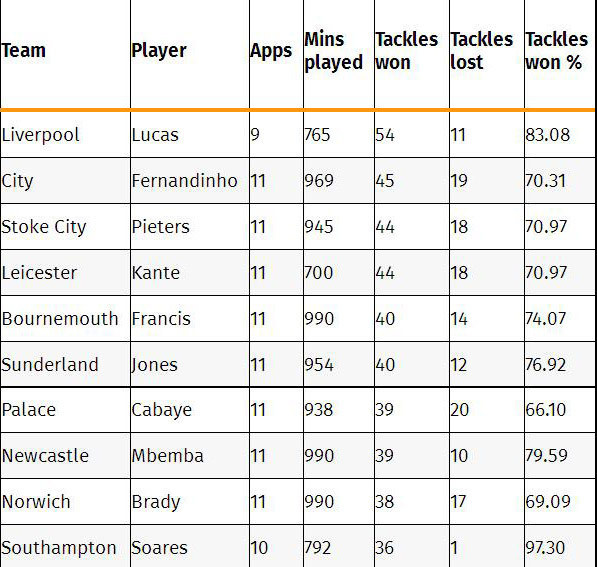 Hal tersebut dibuktikan olehnya setelah didapuk sebagai pemain dengan tekel terbaik di Premier League. Harian Standard membeberkan sejumlah data mengenai statistik tekel yang dilancarkan oleh pemain asal Brasil tersebut.
