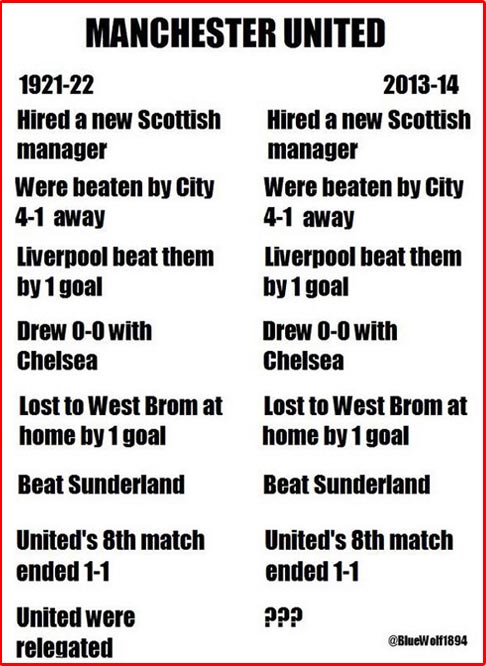 Sebagian media Inggris mulai menemukan beberapa fakta unik mengenai pencapaian United di bawah Moyes sejauh ini. Ada beberapa fakta yang kebetulan sama dengan yang dialami United pada musim 1921-22 silam.
