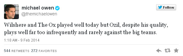 Pascalaga, Owen menyuarakan pendapatnya lewat Twitter. Dia mengatakan: "(Jack) Wilshere dan The Ox (Chamberlain) tampil bagus hari ini, tapi Ozil, terlepas dari kualitasnya, bermain mengecewakan seperti yang sering dia tunjukkan ketika melawan tim-tim besar,"