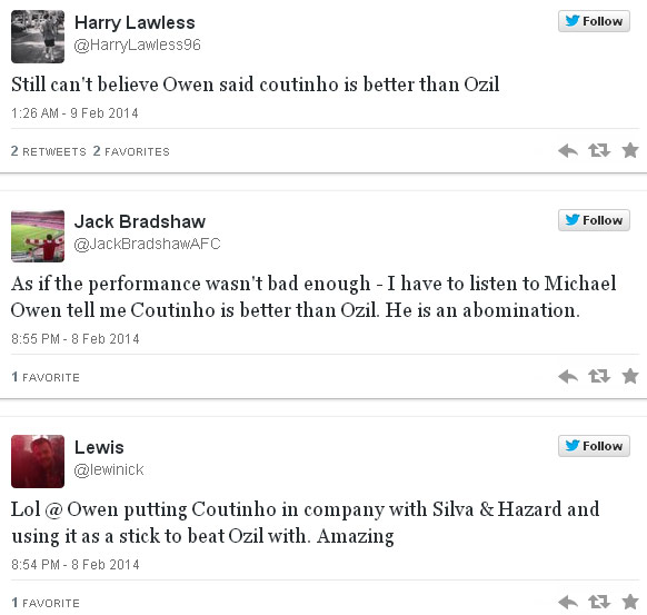 Dilansir Here is the City, komentar Owen itu 'sukses' membuat para fans Arsenal geram. Terlebih lagi, di tengah laga, dia mengatakan bahwa playmaker Liverpool Philippe Coutinho lebih bisa diandalkan daripada Ozil saat benar-benar dibutuhkan oleh timnya.