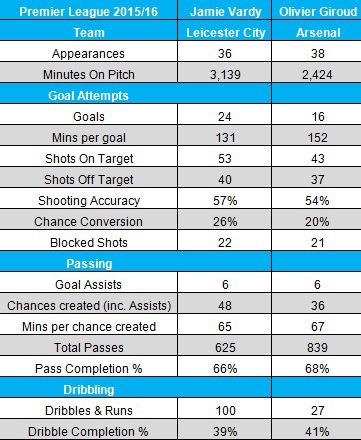 Secara umum, statistik Vardy memang lebih baik dari Giroud kecuali dalam beberapa hal. Urusan memberikan umpan, Giroud lebih banyak dan lebih tepat. Vardy lebih baik dalam hal lain, termasuk jumlah tembakan tepat ke gawang, konversi peluang dan menggiring bola.