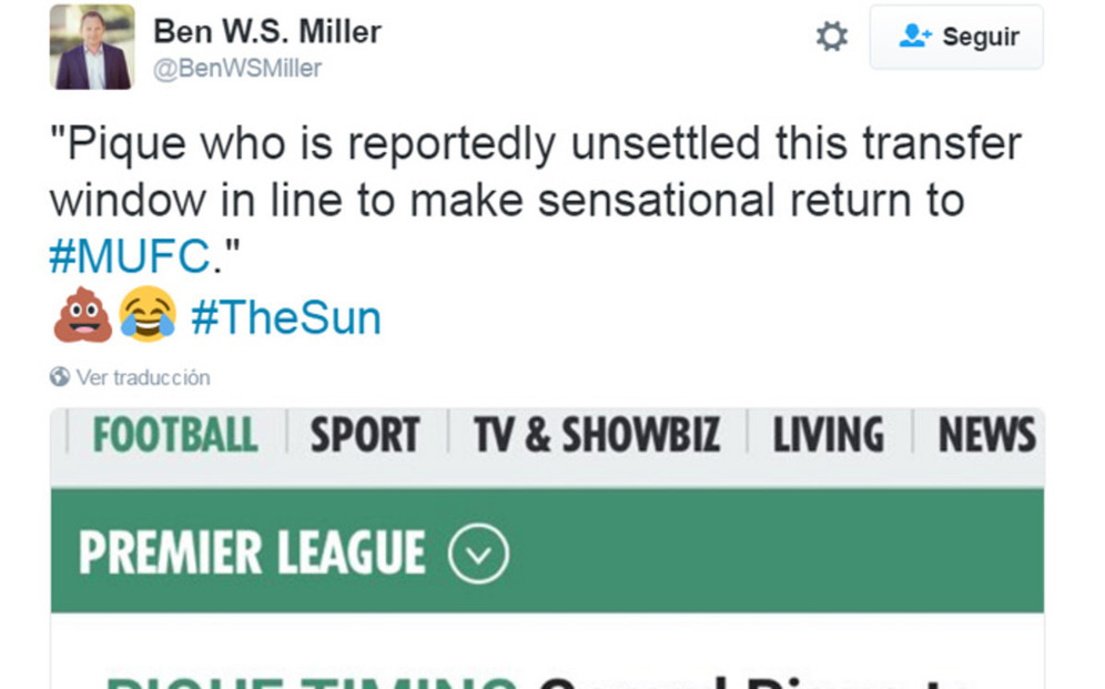 Dengan menggunakan Twitter miliknya, Miller me-retweet rumor dari The Sun yang berbunyi: "Pique, yang dikabarkan tidak merasa senang di bursa transfer kali ini, tidak lama lagi akan mempertimbangkan untuk kembali ke Manchester United."