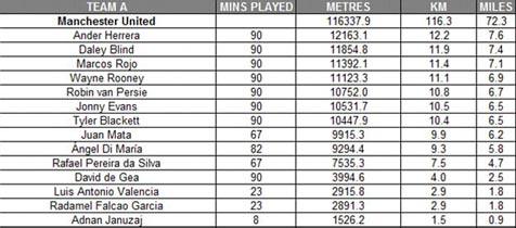 Sementara itu, gelandang anyar United Ander Herrera menjadi yang paling rajin berlari dalam pertandingan. Herrera berlari total sejauh 12,2 kilometer selama 90 menit penuh. Berikut adalah daftar daya jelajah para pemain United.