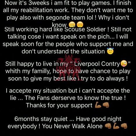 Dalam curhatnya, Sakho menyebut dirinya tidak senang ada pihak yang berbohong mengenai situasi yang dihadapinya di skuat The Reds saat ini.
