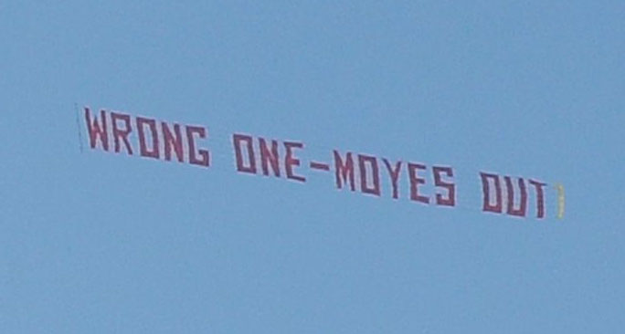 Spanduk bertuliskan 'Wrong One - Moyes Out' tersebut didanai oleh sekelompok fans setan merah yang marah dan kecewa terhadap performa David Moyes di klub. Namun nyatanya, tim justru menang 4-1 melawan The Villans.