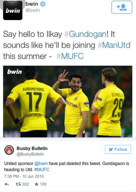 Bwin merupakan sponsor betting dan online gaming resmi United dan pekan ini mereka memberikan sambutan pada Gundogan, yang diklaim segera menjadi pemain baru Setan Merah, menurut laporan Manchester Evening News.