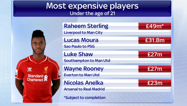 Dalam grafis yang dirilis oleh pihak Sky Sports, terlihat bagaimana pemain 20 tahun tersebut memimpin di urutan teratas. Yang lebih mengejutkan adalah besarnya jumlah yang menjadi gap atau perbedaan antara Sterling dengan posisi nomor dua, Lucas Moura, yakni senilai 17,2 juta Pounds.