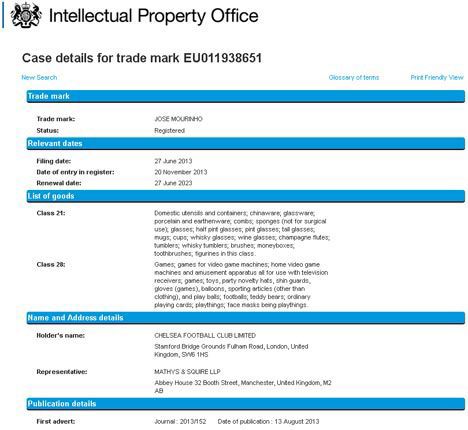 Maksudnya, hak pencitraan nama Jose Mourinho plus semua atribut tentang dirinya masih dimiliki oleh . Hal ini sudah didaftarkan di Kantor Kekayaan Intelektual Inggris Intellectual Office). Hak itu dikuasai Chelsea sejak 20 November 2013 hingga 27 Juni 2023 mendatang.