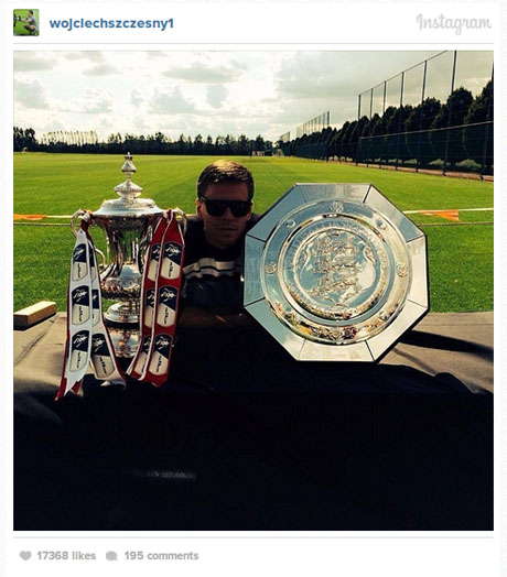 Tak lupa, Szczesny menuliskan kalimat: "Berharap bisa berfoto bersama trofi Premier League tahun depan. #Arsenal #szczesny #facup #communityshield #proud #happy."