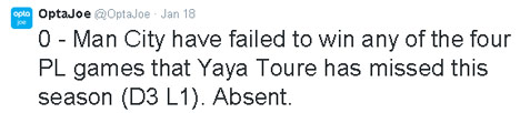 Dengan begitu, berarti City tak pernah menang dalam empat laga tanpa diperkuat Yaya Toure di Premier League musim ini. Hasilnya adalah tiga kali imbang dan sekali kalah.