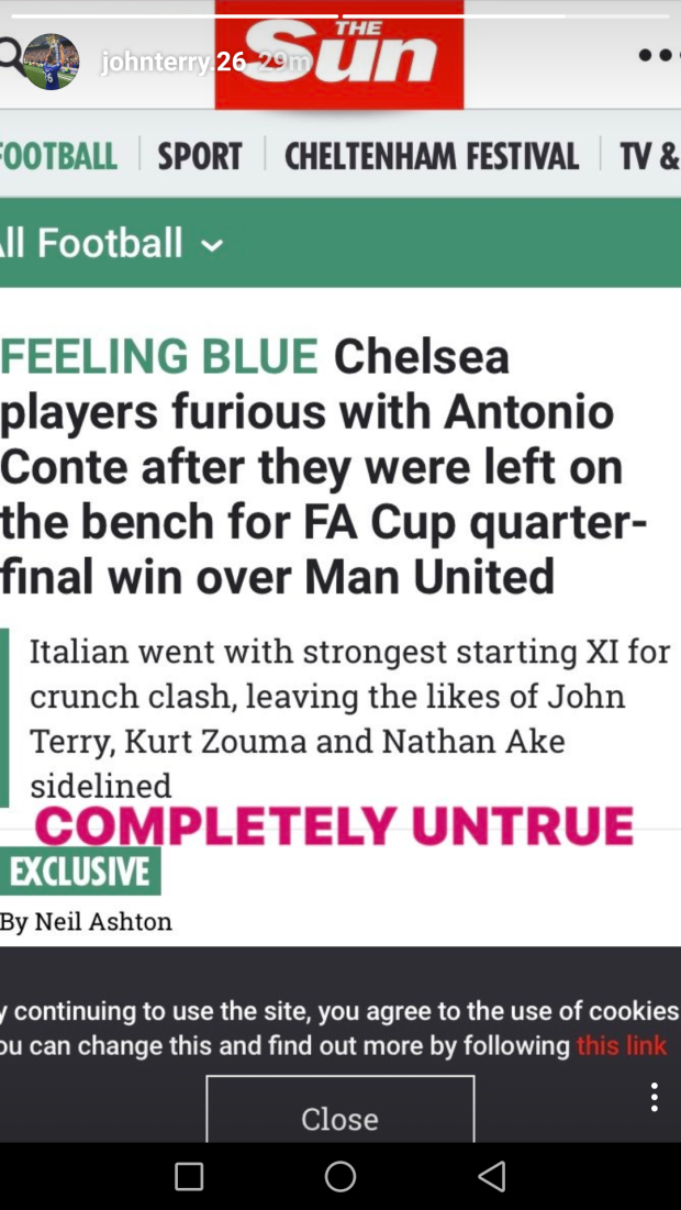 Sebelumnya, The Sun mengklaim bahwa Terry bersama dengan Nathan Ake, Amir Begovic, Nathaniel Chalobah dan Kurt Zouma jengah dengan pelatih. Sebab, para pemain tersebut tak diberikan waktu bermain di pertandingan perempat final FA Cup menghadapi Manchester United Selasa (14/3) kemarin.