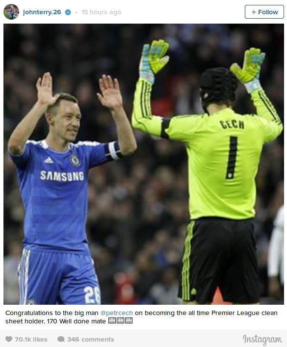 Terry lantas belum lama ini mengucap selamat atas pencapaian luar biasa Cech. Dengan menggunakan akun Instagram, sang kapten menulis: "Selamat untuk sang pemain besar, Petr Cech, yang sudah menjadi kiper dengan jumlah clean sheet terbanyak di Premier League - 170, bagus teman."