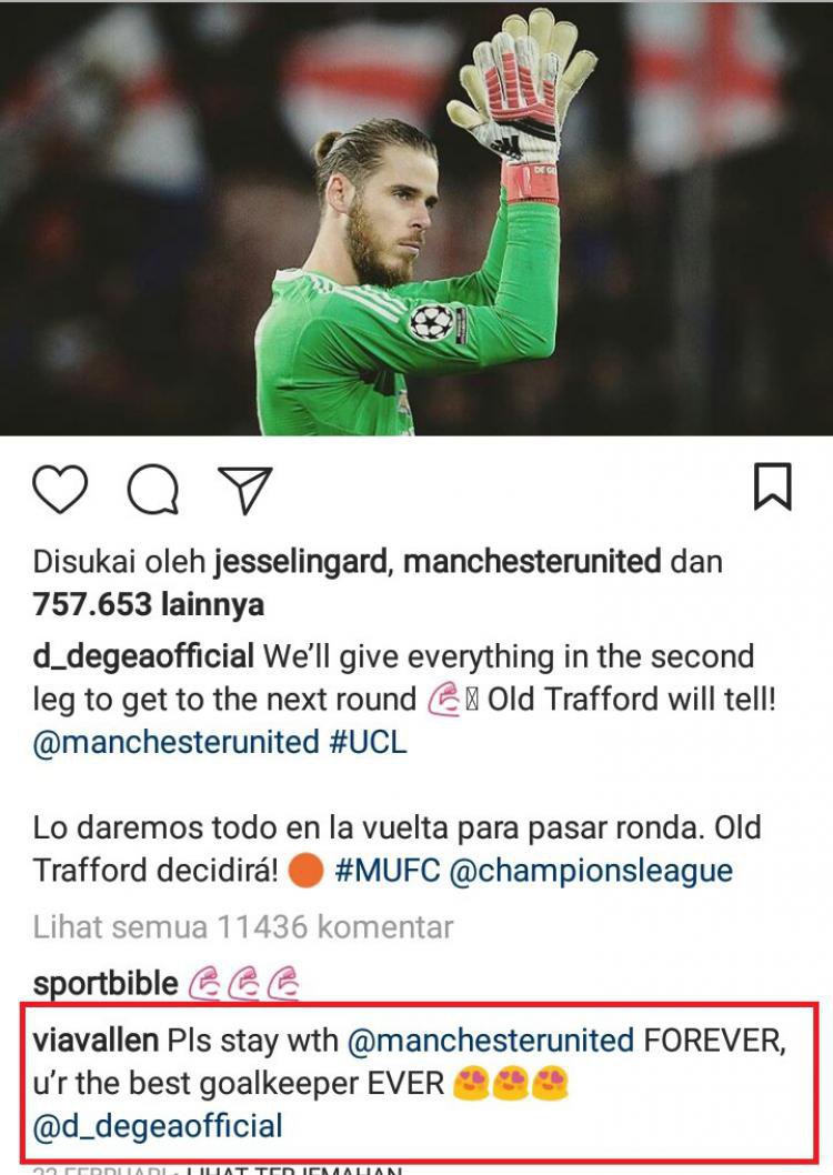 "Kumohon tetap bertahan bersama @manchesterunited selamanya, kamu adalah kiper terbaik yang pernah ada," demikian tulis Via kepada De Gea di kolom komentar ketika pemain mem-posting sebuah foto jelang pertandingan di Liga Champions.