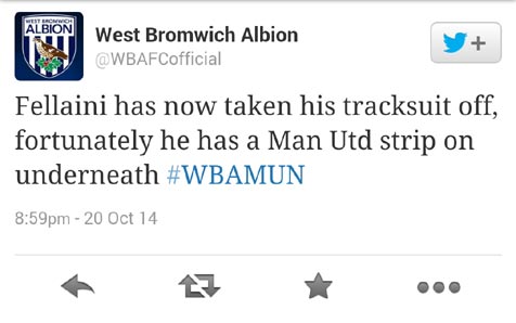 Beberapa saat sebelum Fellaini masuk ke lapangan, ternyata akun Twitter resmi West Brom sempat mengejeknya. "Fellaini sudah melepas jaketnya, untungnya dia memakai jersey Manchester United," demikian kicau akun resmi West Brom.