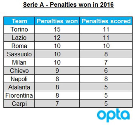 Di bawah Torino adalah Lazio, yang mendapatkan 12 hadiah penalti di Serie A selama periode awal Januari sampai akhir Desember 2016. Di sepuluh besar, juga bercokol nama AS Roma (10), AC Milan (10), Napoli (8) dan (8).