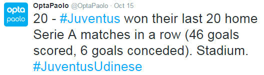 Dengan kemenangan atas Udinese, berarti Juventus selalu menang dalam 20 laga kandang terakhirnya di Serie A. Dalam 20 laga kandang itu, pasukan Massimiliano Allegri juga mencetak total 46 gol dan cuma kebobolan enam.