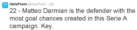 Hingga giornata 19, Darmian tercatat sebagai bek yang paling rajin mengkreasi key passes atau operan-operan berpeluang gol buat rekan-rekannya. Sejauh ini, key passes Darmian sudah menyentuh angka 22.
