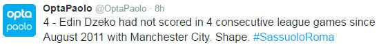 Dengan doppietta alias dua gol ke gawang Sassuolo, berarti Dzeko sudah mencetak gol dalam empat penampilan terakhirnya untuk Roma di Serie A. Terakhir kali Dzeko mencetak gol dalam empat penampilan beruntun di liga adalah pada Agustus 2011 silam, yakni ketika masih memperkuat Manchester City di Premier League.