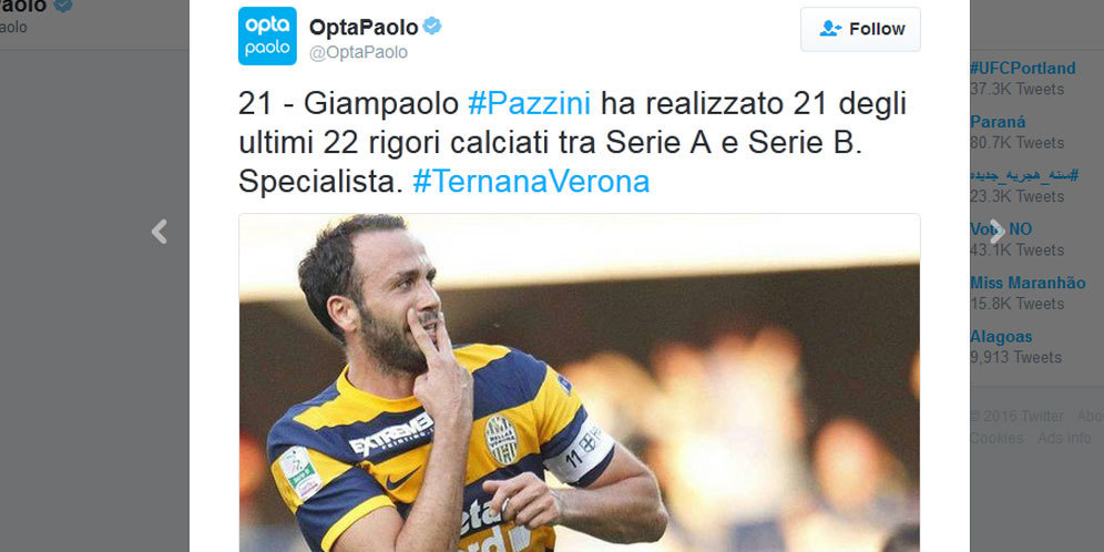 Kedua gol Pazzini dicetak dari titik putih. Hal ini membuatnya memiliki catatan, seperti yang dirangkum oleh Opta, tendangan penalti yang nyaris sempurna. Pemain yang pernah membela AC Milan dan Inter Milan ini sukses mencetak 21 gol dari 22 eksekusi penaltinya.