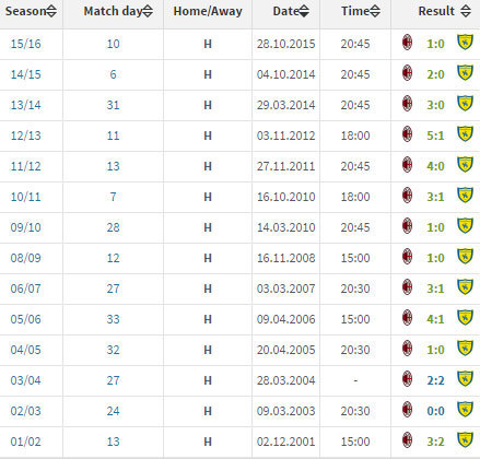 Pada pertemuan pertama di Serie A musim ini, Milan menang 3-1 di kandang Chievo. Gol-gol Juraj Kucka, M'Baye Niang dan bunuh diri Dario Dainelli hanya bisa dibalas sekali oleh Valter Birsa.