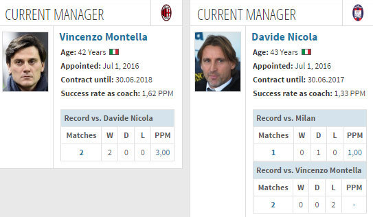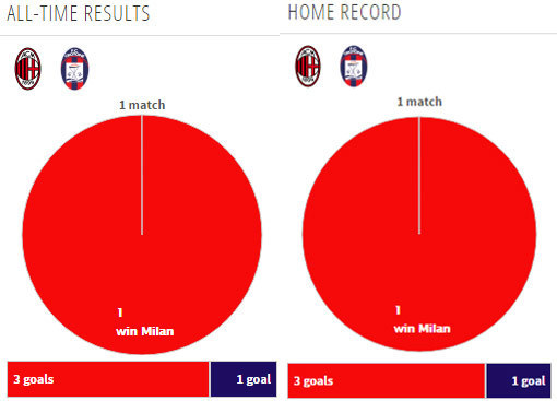 Milan baru pernah sekali bertemu dengan Crotone, yakni di putaran 4 Coppa Italia musim 2015/16. Waktu itu, Milan menang 3-1 lewat extra time di San Siro dan lolos ke babak 16 besar. Tiga gol Milan dilesakkan oleh Luiz Adriano, Giacomo Bonaventura dan M'Baye Niang.
