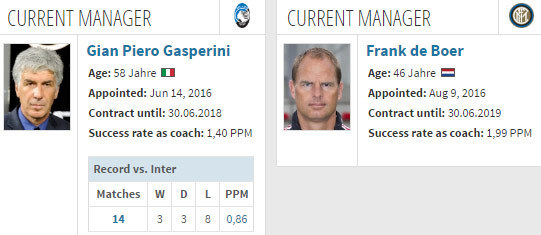 - Peringkat 13 Atalanta akan menjamu peringkat 11 Inter Milan di giornata 9 Serie A 2016/17, Minggu (23/10). Berikut catatan head-to-head kedua tim.