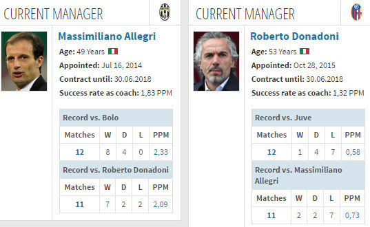 Juventus selalu menang dalam tiga laga kandang terakhirnya melawan Bologna di Serie A. Musim lalu, Juventus menekuk Bologna 3-1 di Turin lewat gol-gol Alvaro Morata, Paulo Dybala (penalti) dan Sami Khedira.