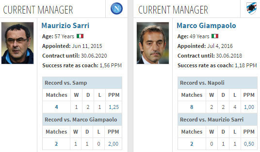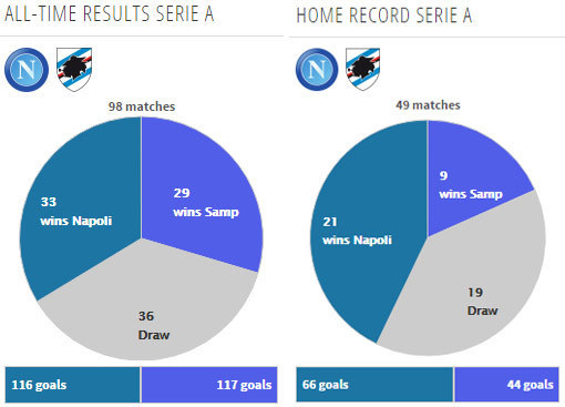 Napoli tak terkalahkan dalam delapan laga kandang terakhirnya melawan Sampdoria di Serie A (M6 S2). Musim lalu, kedua tim bermain imbang 2-2 di San Paolo.