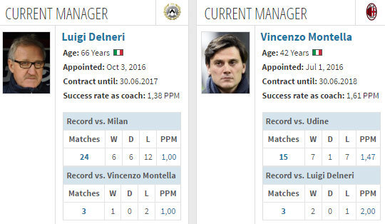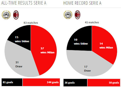 Dalam lima laga tandang terakhirnya melawan Udinese di Serie A, Milan meraih dua kemenangan (K3), yakni 2-1 pada musim 2011/12 dan 3-2 pada musim 2015/16 kemarin.