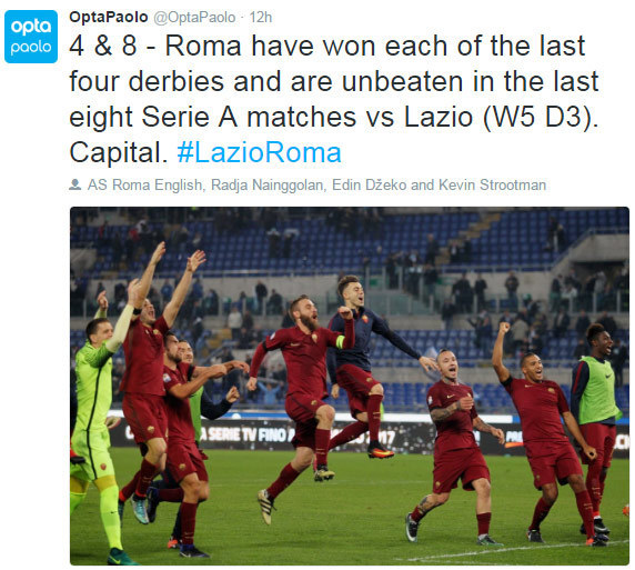 Sejak itu, Roma tak terkalahkan dalam semua derby melawan Lazio. Termasuk yang terkini, berarti Roma sudah menang lima kali dan imbang tiga kali sejak musim 2012/13 di Serie A.