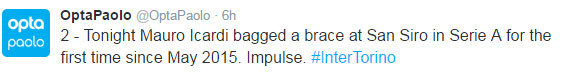 Dengan brace ke gawang Torino, berarti Icardi juga sukses mengakhiri paceklik gol dalam enam laga sebelumnya di semua ajang. Bagi Inter, yang selalu kalah dalam tiga laga terakhirnya di Serie A, ini bisa dibilang merupakan sebuah kemenangan yang cukup melegakan.