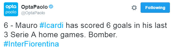 Ketajaman Icardi sedang maksimal, terutama jika Inter bermain di hadapan tifosi-nya sendiri. Dengan doppietta kontra Fiorentina, berarti striker 23 tahun Argentina yang juga kapten Inter itu telah mencetak enam gol hanya dalam tiga laga kandang terakhirnya di Serie A.